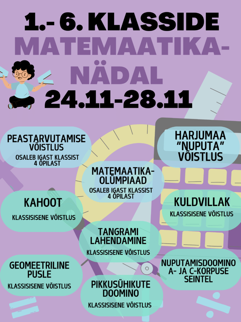 24.-28. novembril toimub Viimsi Koolis 1.-6. klasside matemaatikanädal, mille raames toimuvad põnevad võistlused ja tegevused.