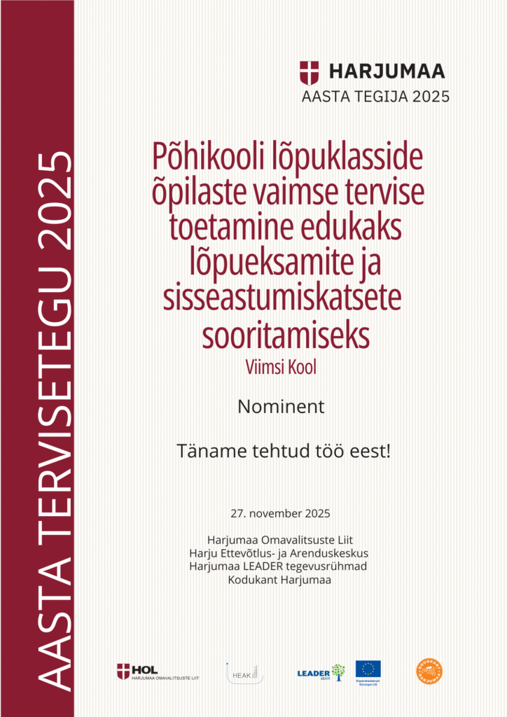 27. novembril toimus Harjumaa Aasta Tegija tunnustusüritus, kus teiste nominentide hulgas oli esindatud ka Viimsi Kool. Meid on märgatud ja tunnustatud põhikooli lõpuklasside õpilaste vaimse tervise toetamise eest, et lõpueksamite ning sisseastumiskatsete sooritamine kulgeks noortel võimalikult pingevabalt ja edukalt.
